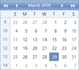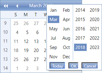 When the date picker has been opened, the user may click on the following parts of the calendar header:
