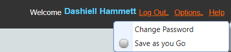 A user may access the following user options by clicking on the "Options" text in the upper right corner of the Menu Bar.