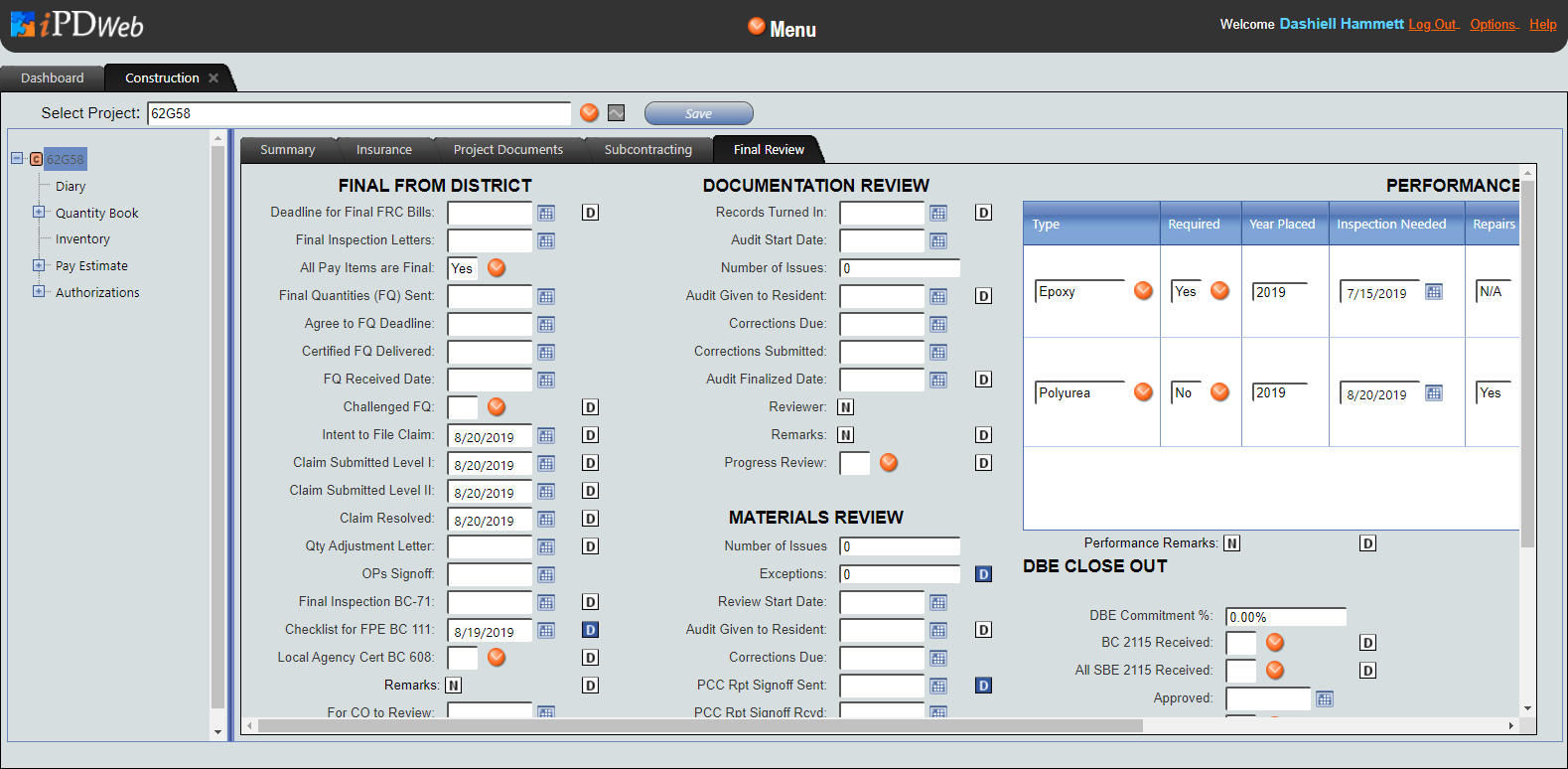The Final Review Tab is used to document the contract close-out process, which includes Final approval and other pertinent information and dates from the district, Documentation Review, Materials Review, Performance Period Status, and DBE Close Out. The Final Review Tab may be accessed through the Construction Contract Window.