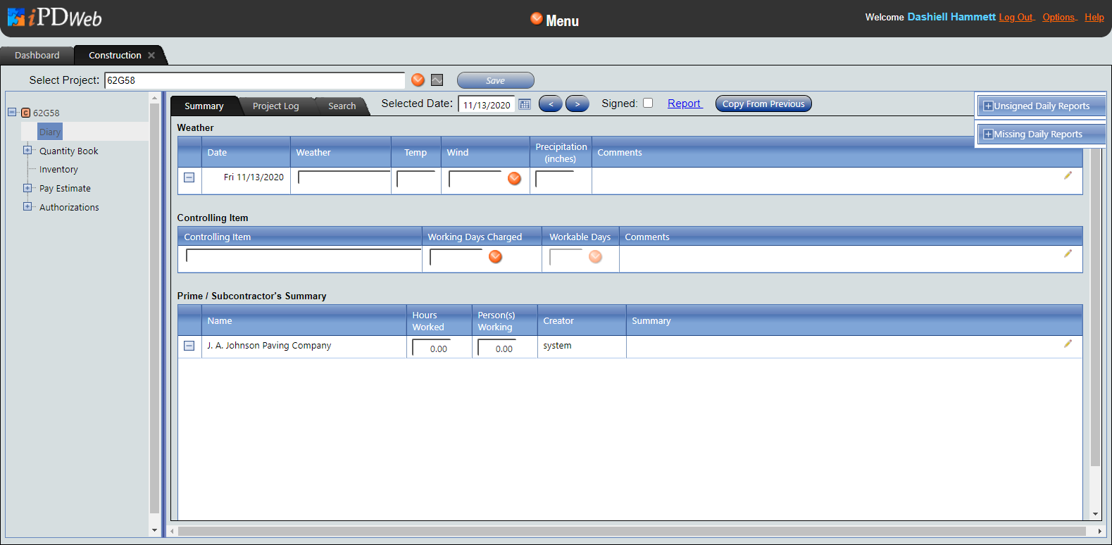 The Diary Window consists of a table of diary entries regarding the progress of the selected contract. Diary entry type can be Log, Weather/Productivity, Controlling Item, or Contractor Labor. These entries can be added, viewed, and searched for using the tabs and functionality in this window. The Diary Window is composed of windows identified by tabs: