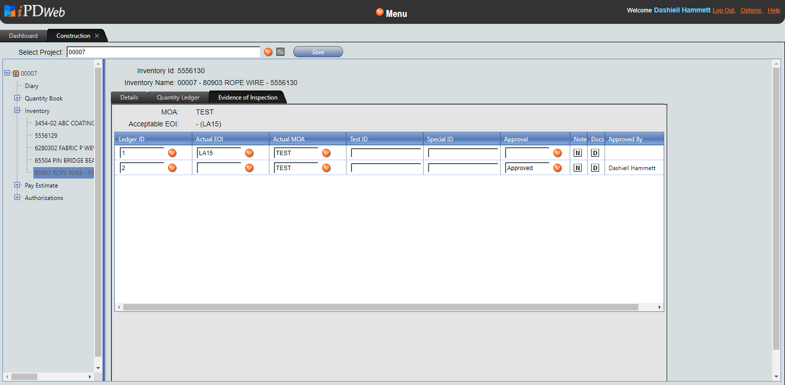 The Evidence of Inspection (EOI) Tab allows for the review and management of evidences of inspection for a specific material inventory. It can be accessed through the Contract Inventory Window.