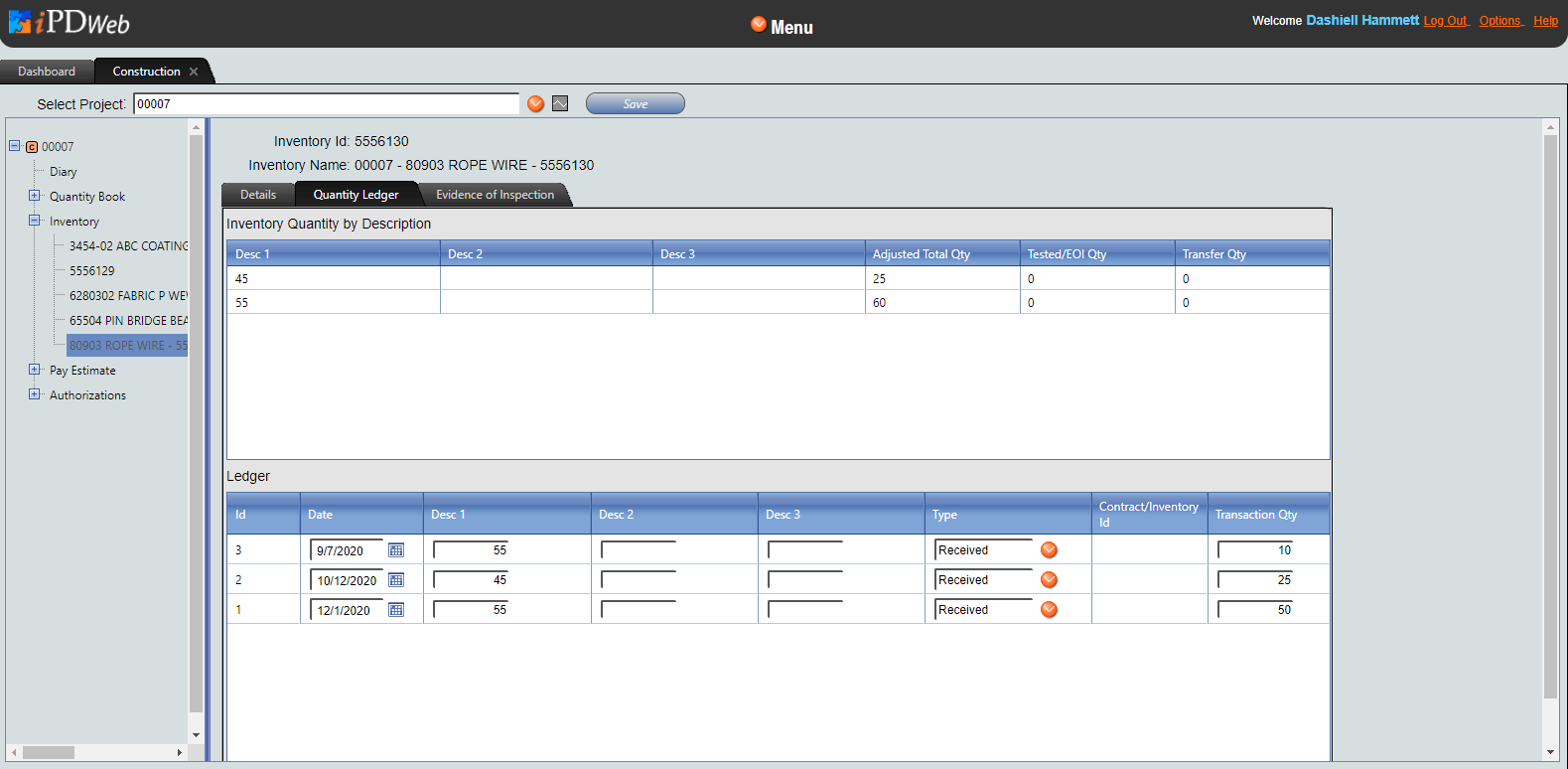 The Quantity Ledger Tab allows for the review and management of the quantity ledger related to a specific material inventory. It can be accessed through the Contract Inventory Window.