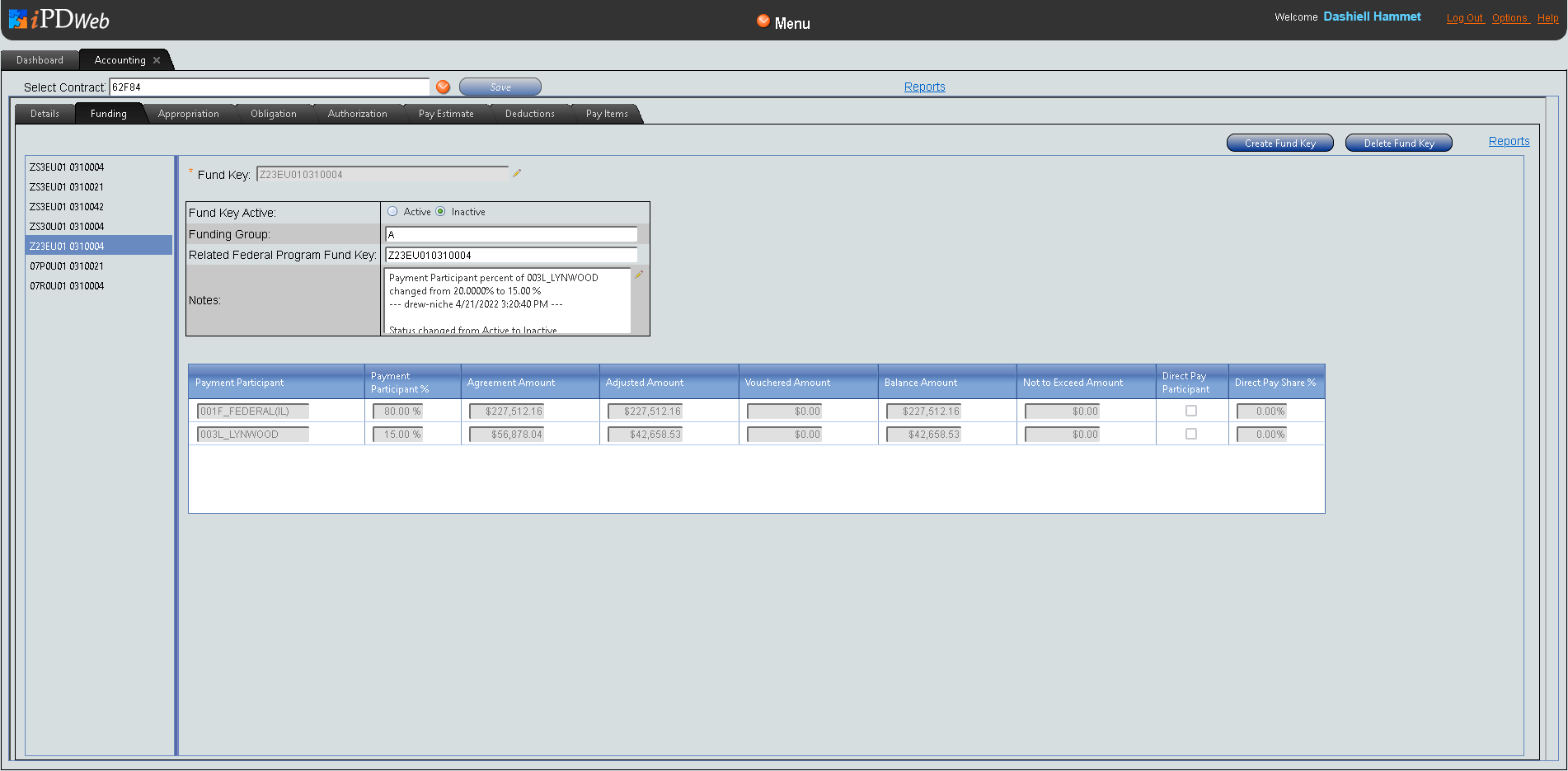The Accounting Funding Tab is composed of a list on the left-hand side, which displays all fund keys associated with the selected contract, and a detail window on the right, which consists of editable header information and a table of payment participants. The detail window on the right displays details according to the fund key selected from the list on the left. From this tab, authorized users can manually add fund keys, edit fund key information, delete fund keys, add and remove payment participants, add comments, and run reports.