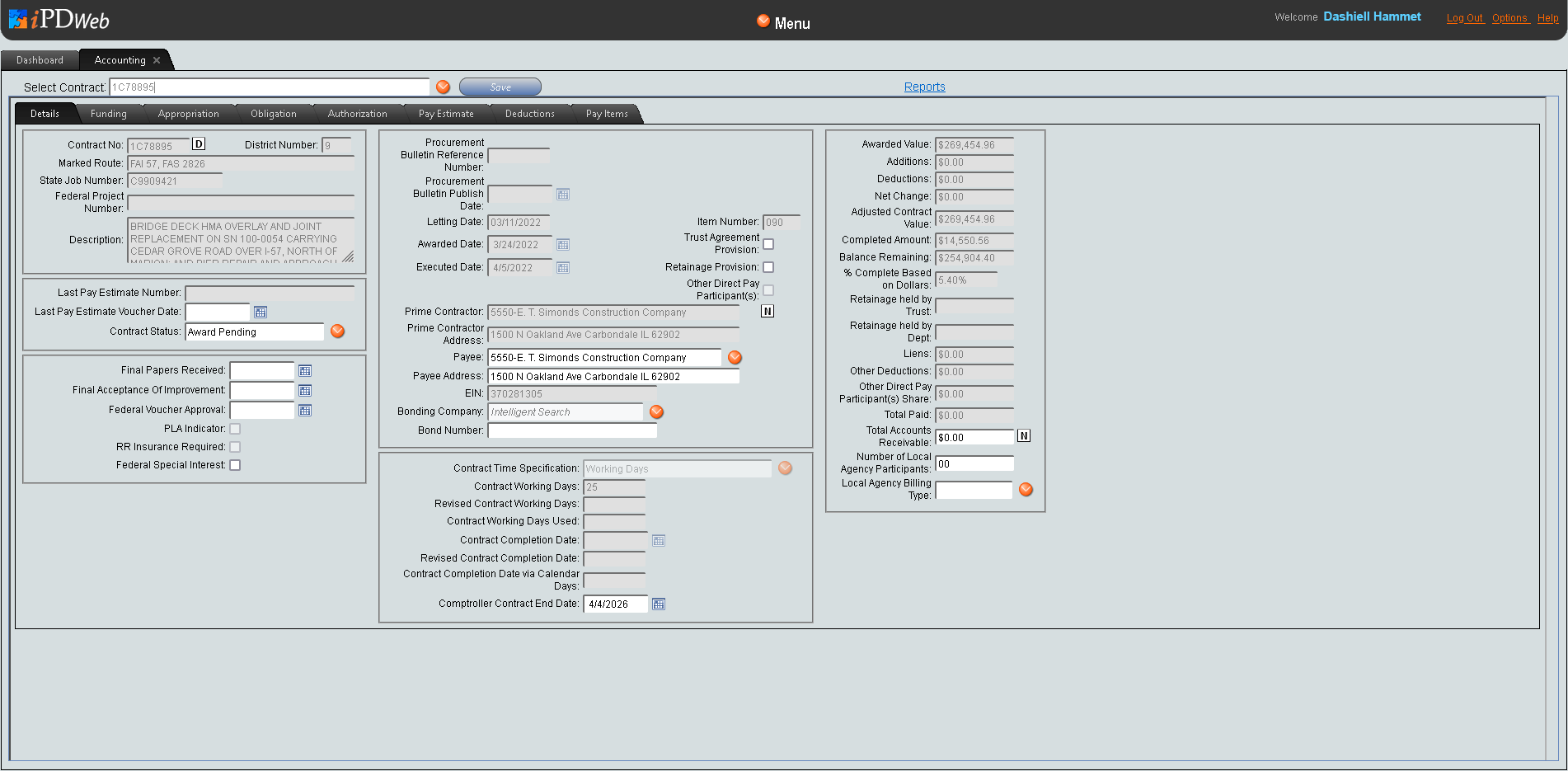 Pay Items Tab – allows users to review summary information concerning contract pay items.