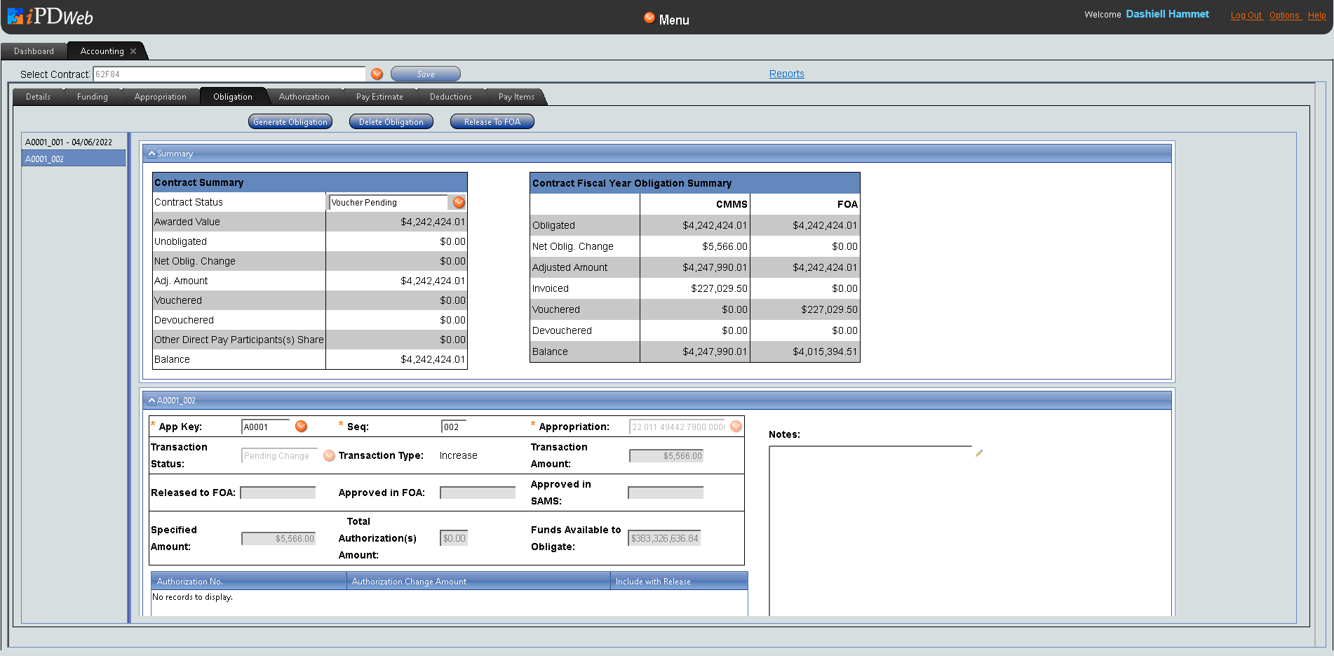 The Obligation Tab is composed of a list on the left-hand side, which displays all obligation transactions associated with the selected contract, and a detail window on the right, which consists of two accordion windows. The Summary Accordion Window displays two contract-level summary tables, auto-populated with information from CMMS, ELM, and FOA. The Obligation Accordion Window below displays information specific to an obligation transaction, including general obligation information, a table of associated authorizations, and obligation notes. The detail window on the right displays details according to the obligation transaction selected from the list on the left. From the Obligation Tab, authorized users can generate new obligation transactions, edit existing ones, release obligation transactions to FOA, add comments, and run reports.