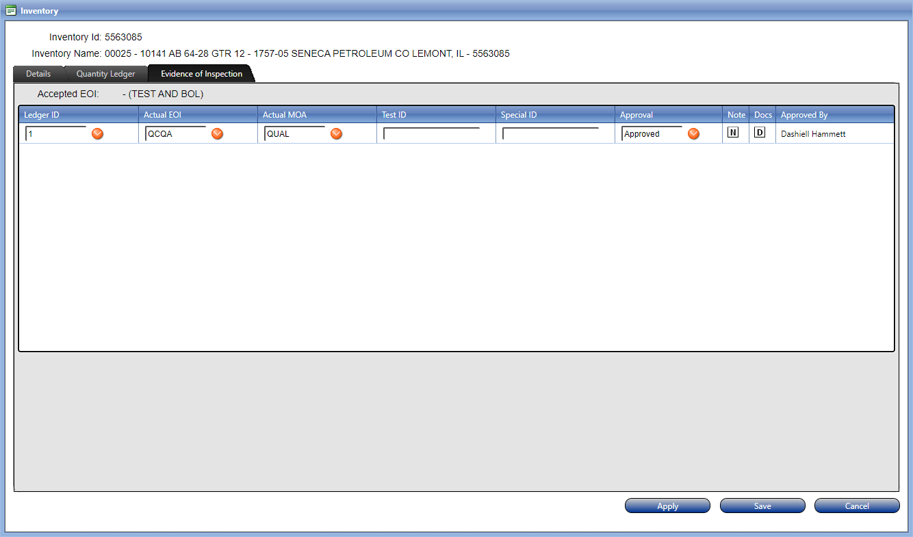 The Evidence of Inspection (EOI) Tab allows for the review and management of evidences of inspection for a specific material inventory. It can be accessed through the Inventory Detail Window.