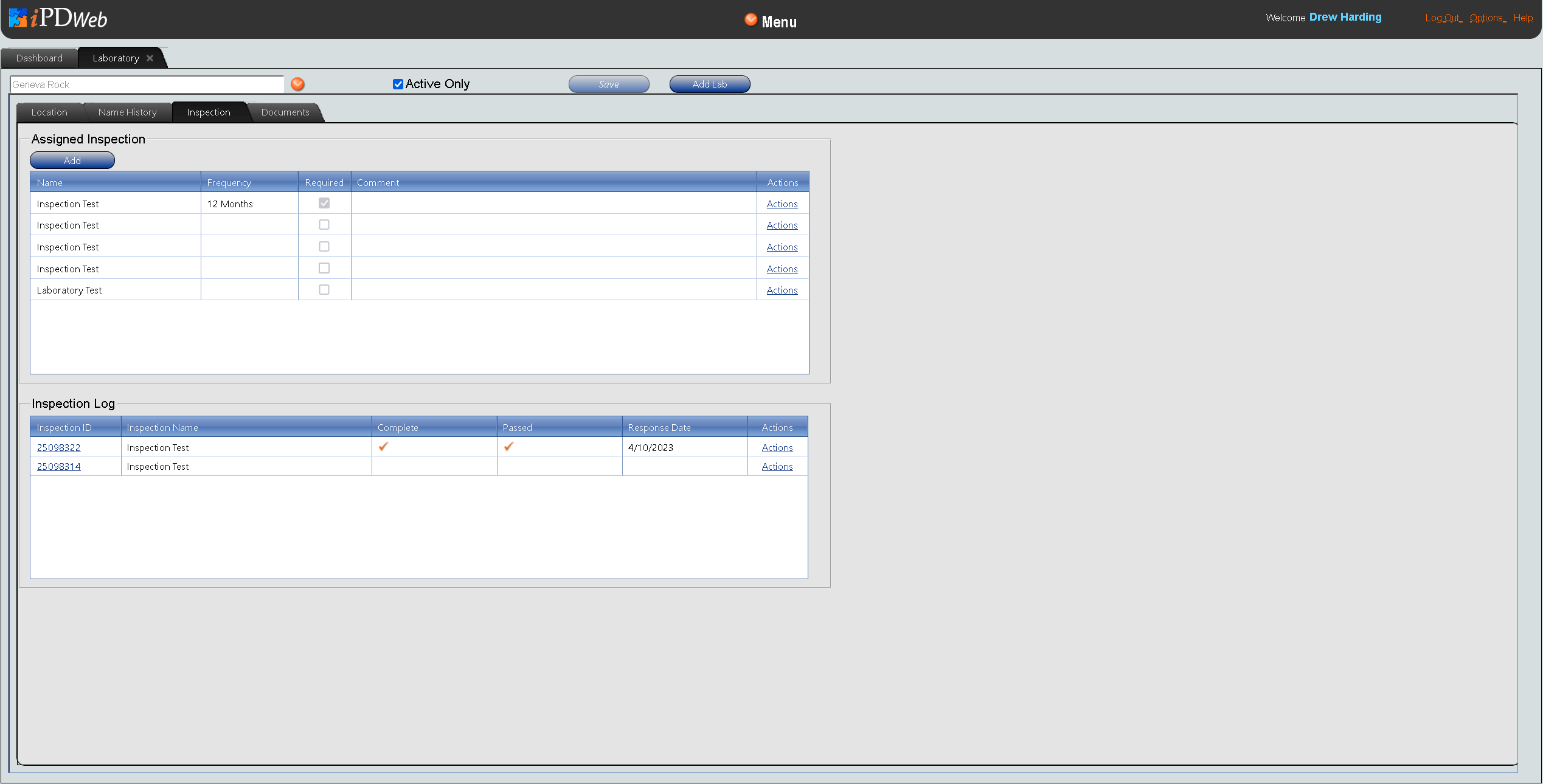 The Inspections Tab consists of two tables. The Assigned Inspection table displays information pertaining to any inspections assigned to the selected laboratory, including information such as name, frequency, comments, etc. Inspections can be added, edited, deleted, and executed from here. The Inspection Log table displays all inspections that have been executed, whether they have been passed or completed. Users can view laboratory inspection results from this table by clicking on any blue inspection ID links.