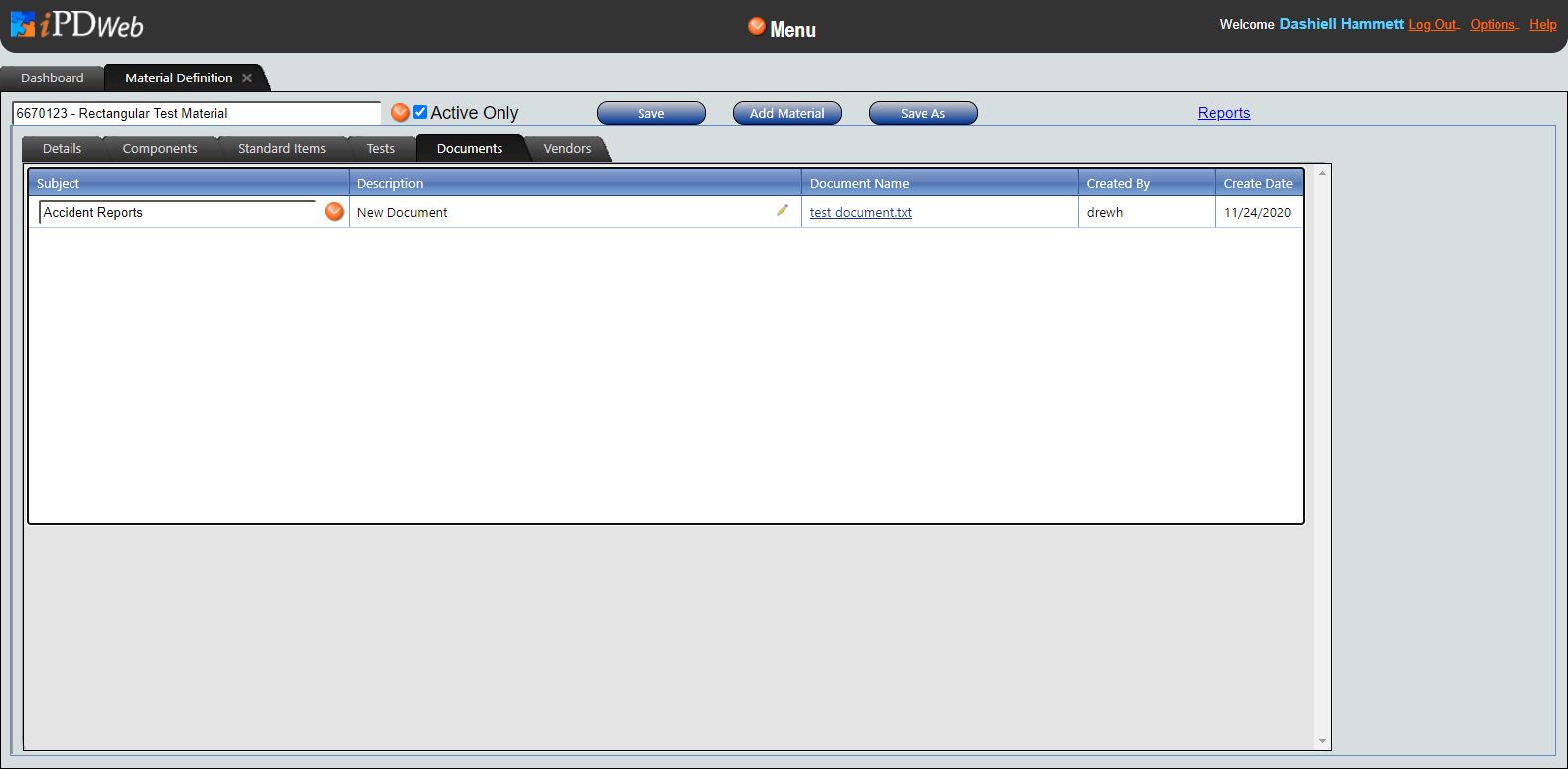 The Material Documents Tab allows for the review and management of documents related to a material. It can be accessed through the Material Definition Window.