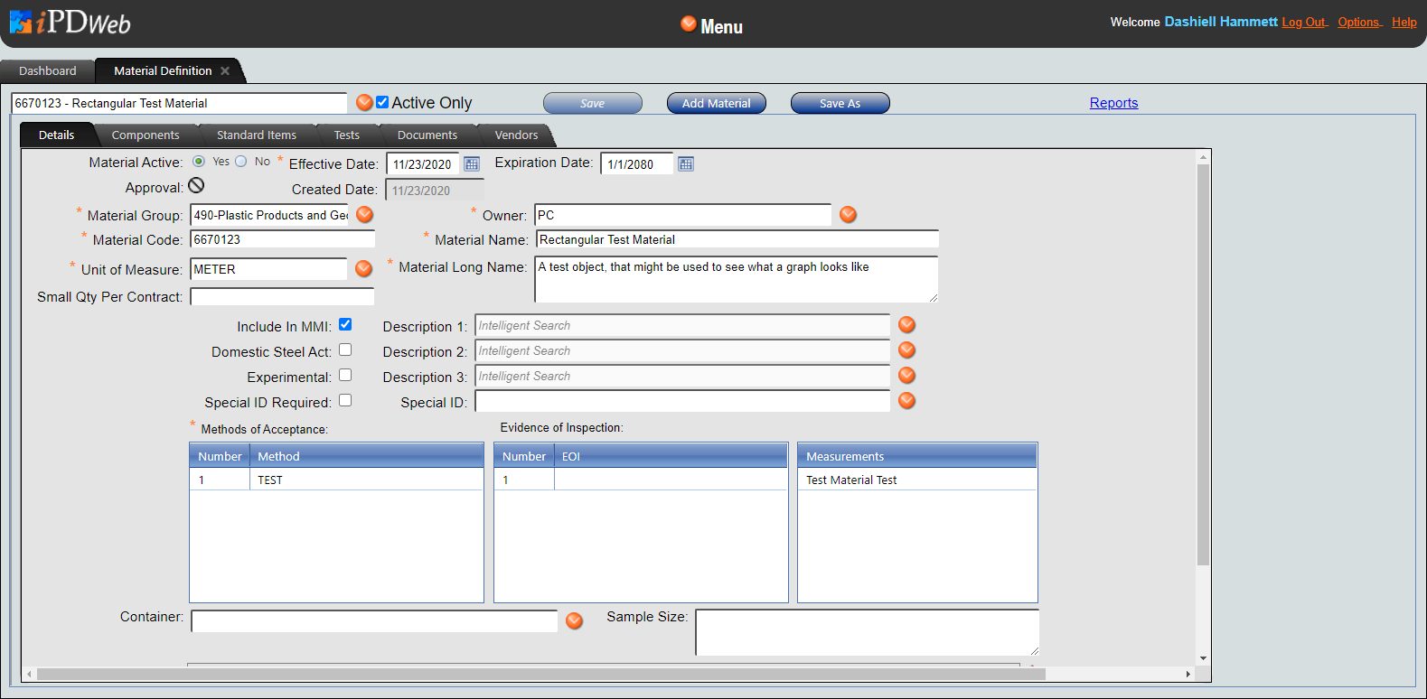 The Material Definition Window allows for the review and management of materials, including related components, items, tests, documents, and vendors.