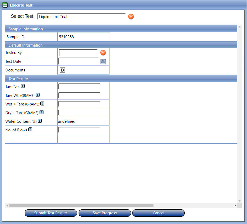 The process to execute a mix design test is available through the Mix Design Tests Tab of the Mix Design Details Tab. The process is identical to executing a test for a mix design template.