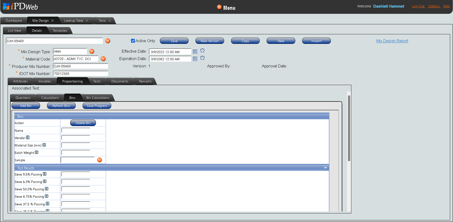 The Bins Tab is used to review and edit the mix design worksheet. It can be accessed through the Proportioning Tab of the Mix Design Details Tab. Users can edit these elements for a mix design template in the Template Bins Tab.