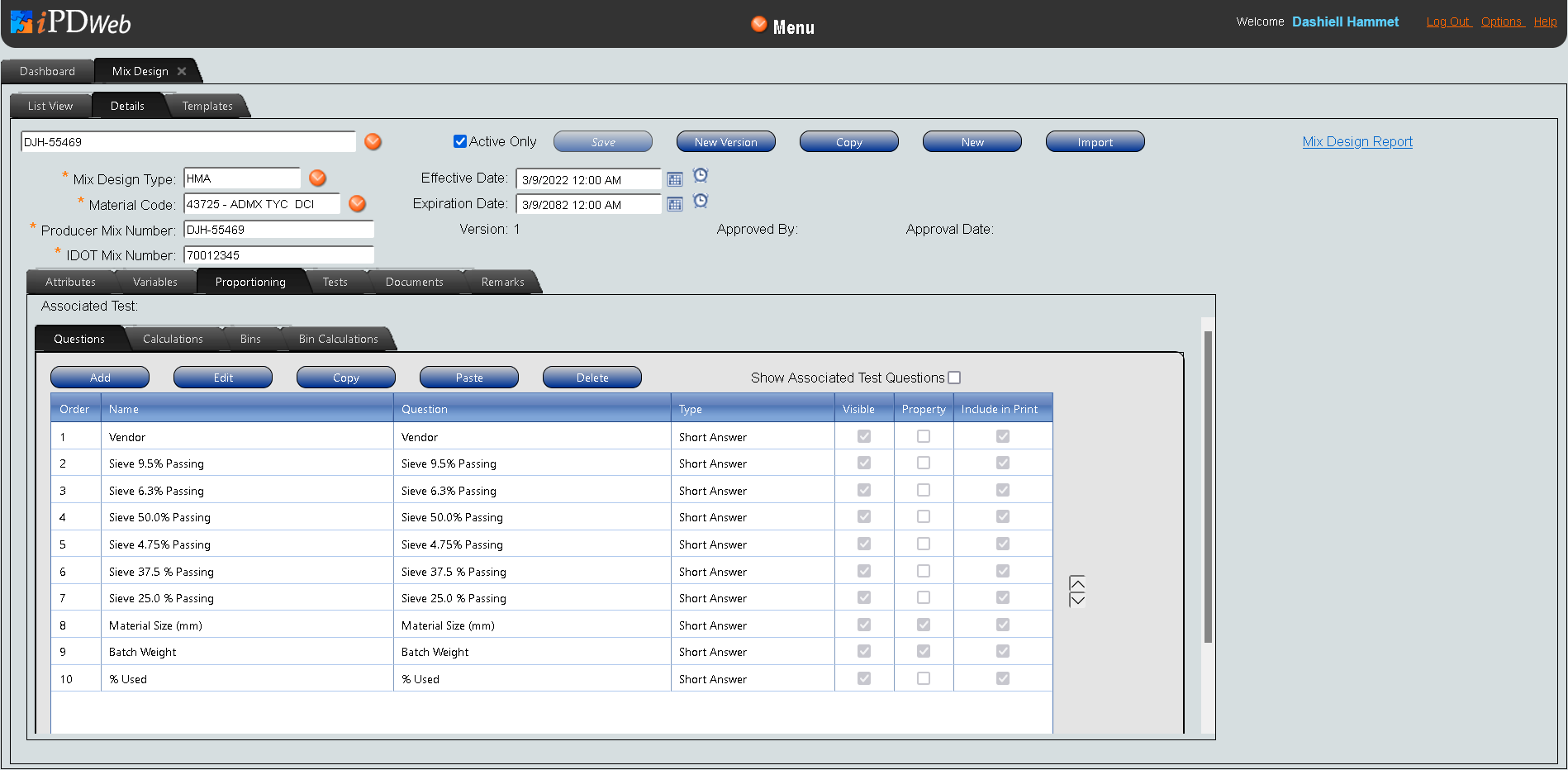 The Proportioning Tab allows users to edit the questions, calculations, and bins associated with a given mix design. From here, users can edit how a mix design draws information from its associated test and how it generates material for the mix design worksheet. It can be accessed through the Mix Design Details Tab. Users can edit these elements for a mix design template in the Templates Proportioning Tab.