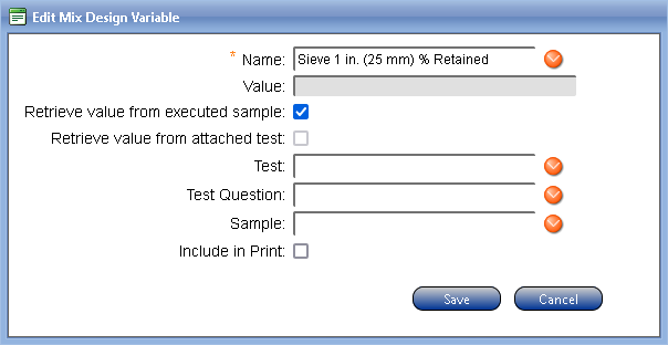 Check the "Retrieve value from attached test" box if desired. This will automatically populate the Value field with information from a test attached to a mix design through the Mix Design Tests Tab. Select a Test and Test Question from the drop-down menus.