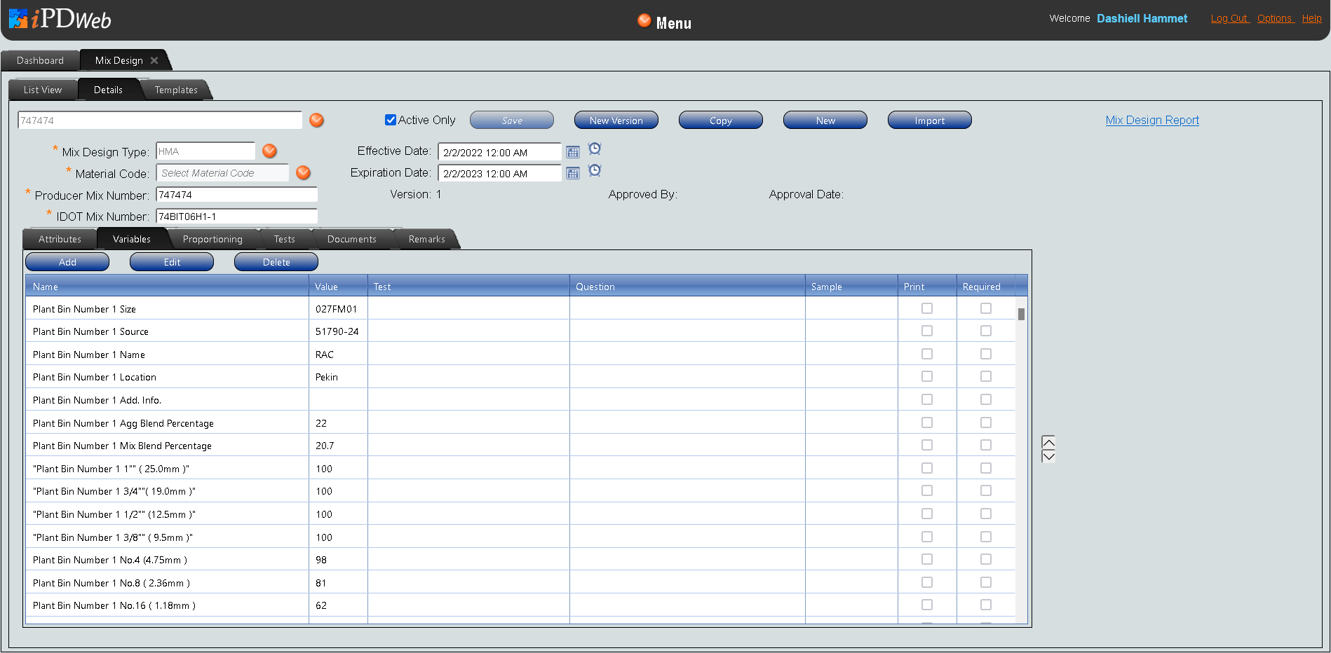 The Variables Tab allows users to edit the variables associated with a given mix design. It can be accessed through the Mix Design Details Tab. Users can edit variables for a mix design template in the Templates Variables Tab.