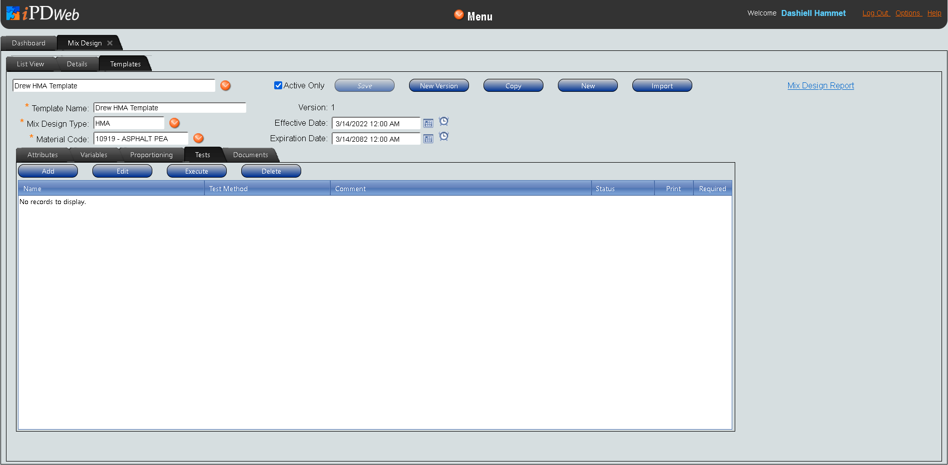 The Templates Tests Tab is used to review and manage tests attached to a mix design template. It can be accessed through the Mix Design Templates Tab. These tests are run against mix designs and often used to generate variables for a mix design. Users can edit these elements for a mix design in the Mix Design Tests Tab.