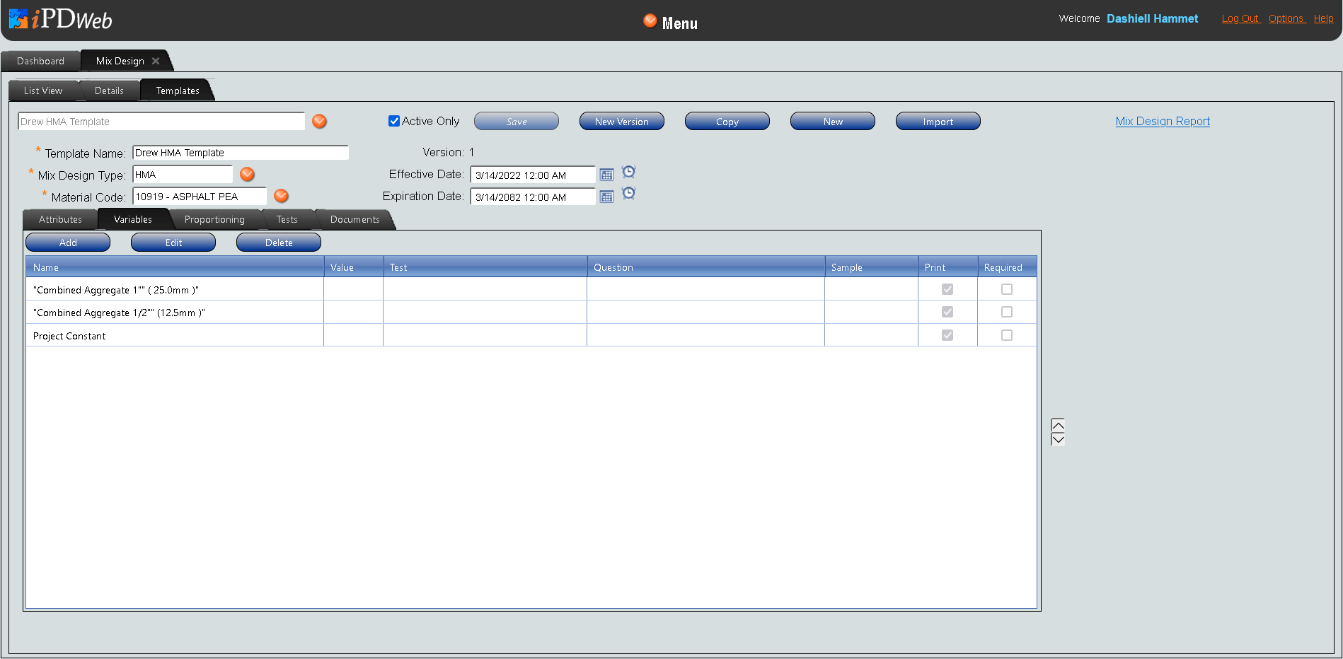 The Templates Variables Tab allows users to edit the variables associated with a given mix design. It can be accessed through the Mix Design Templates Tab. Users can edit variables for a mix design in the Mix Design Variables Tab.