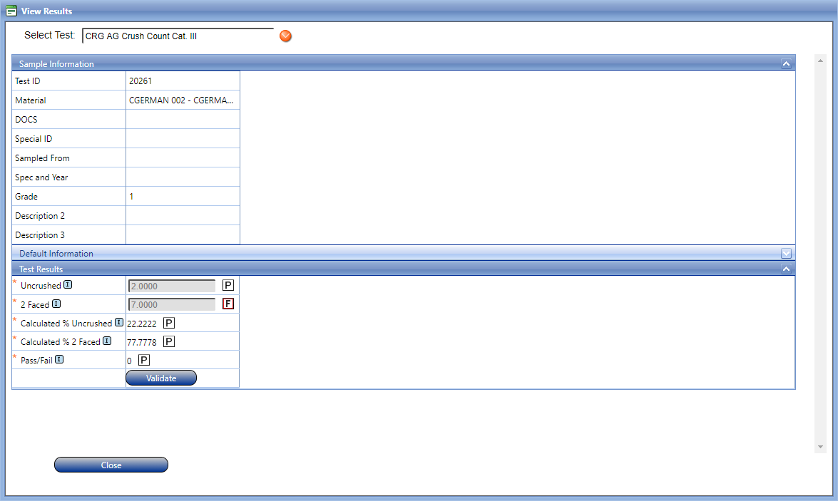 The View Results Window consists of a drop-down menu, a list of test questions, and two buttons at the bottom. The drop-down menu allows users to view any test results related to a specific sample. The test questions are displayed and include recorded responses from a specific instance of a test. From this window, a user can review test results and validate those results.