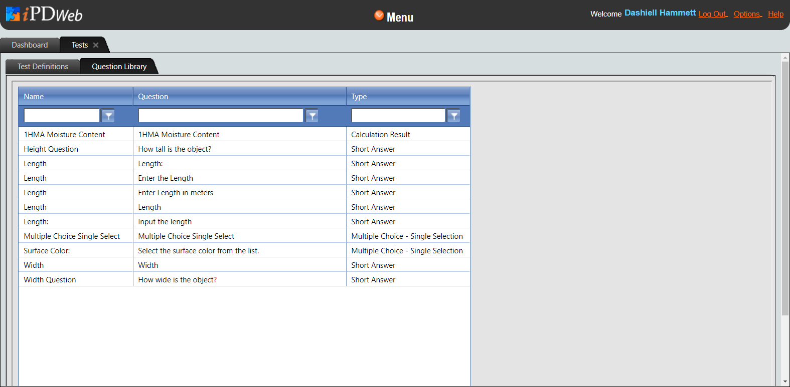 The Question Library Tab allows for the review and management of questions added to the system. It can be found through the Tests Window.