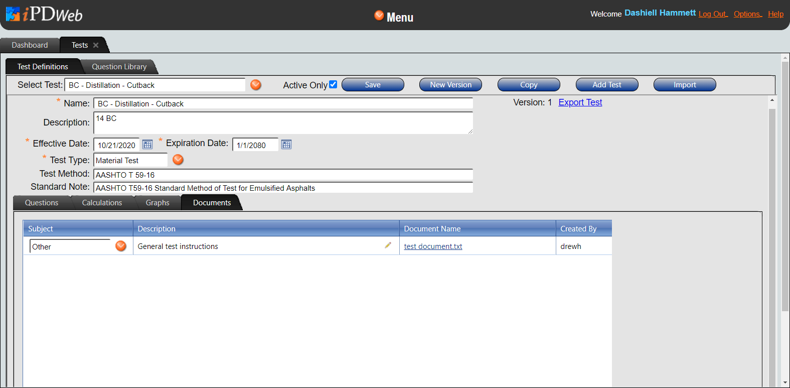 The Test Documents Tab consists of a table with all of the documents for a chosen test. The table includes the document type, description, and name. Document types may include certificates or worksheets.