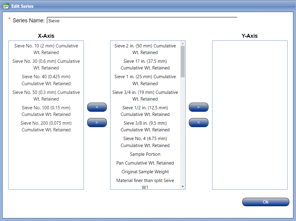 To add to the X-Axis, click on the left arrow (<) button. To add to the Y-Axis, click on the right arrow (>) button.