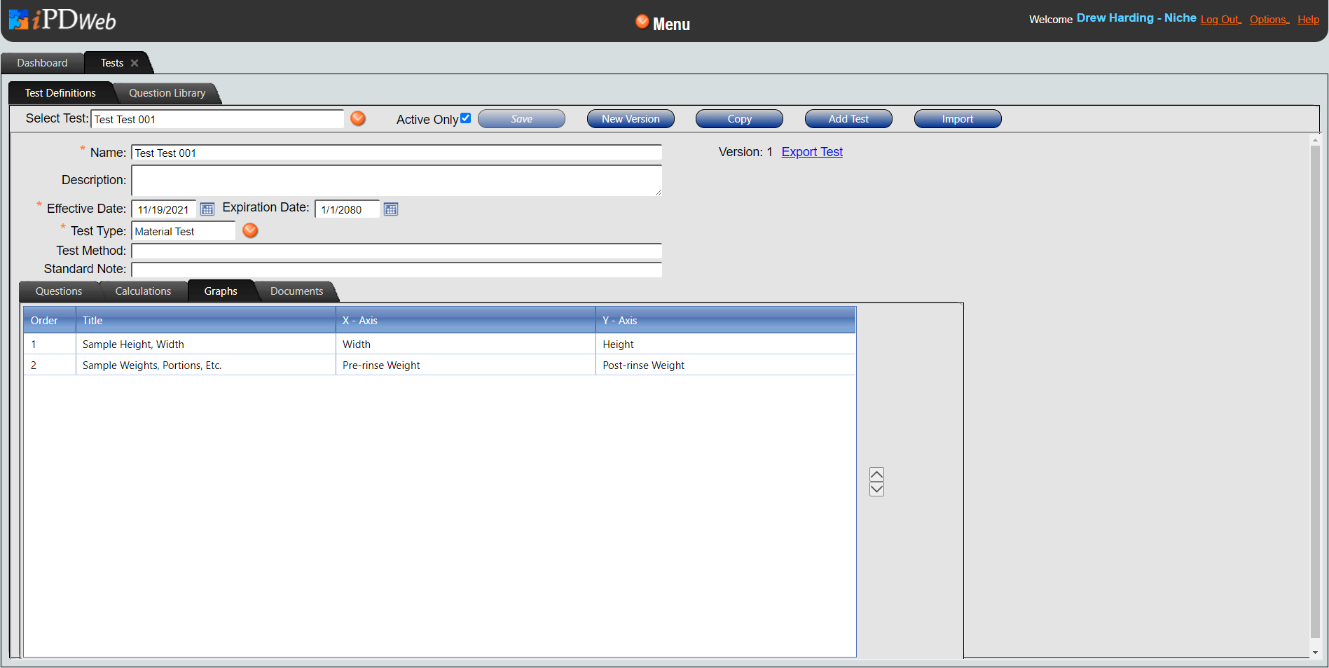 The Graph Tab consists of a table with all of the graphs for a chosen test. The table includes the name and axes of each graph.