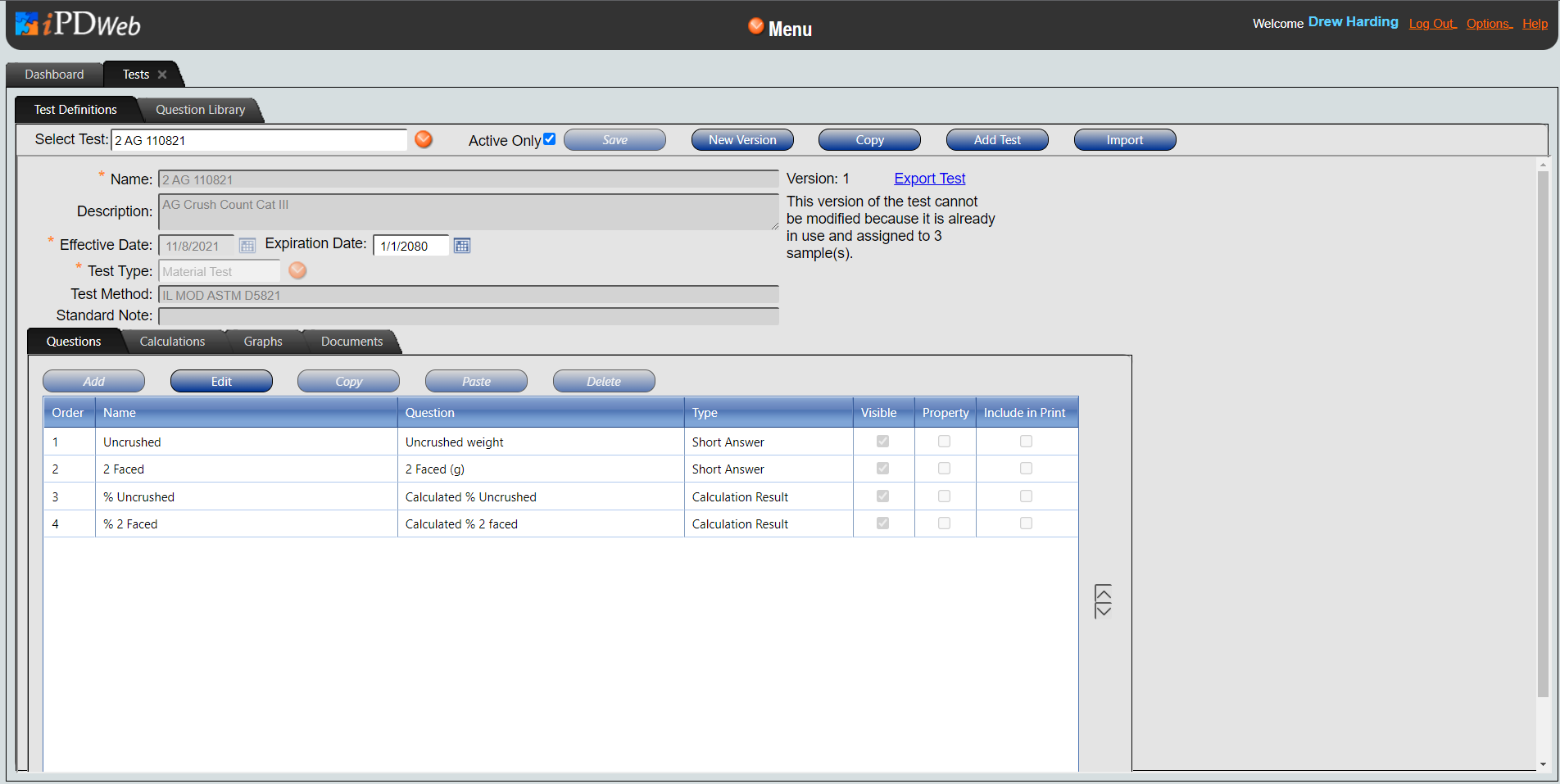 The Test Definitions window is made up of two tabs. Information in the Test Definitions Tab pertains to the test selected in the Select Test drop-down menu, while the Question Library Tab shows all of the questions that have been added to the system.
