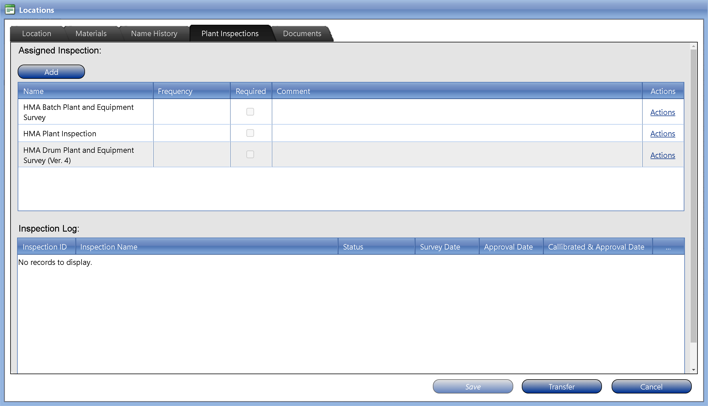 The Plant Inspections Tab allows users to add, edit, and execute plant inspections for vendor locations. It can be accessed through the Location Detail Window. The Plant Inspections Tab will only appear if a location is assigned either the "HMA Plant" or "Portland Cement Concrete (PCC)" location type in the Specific Location Tab.