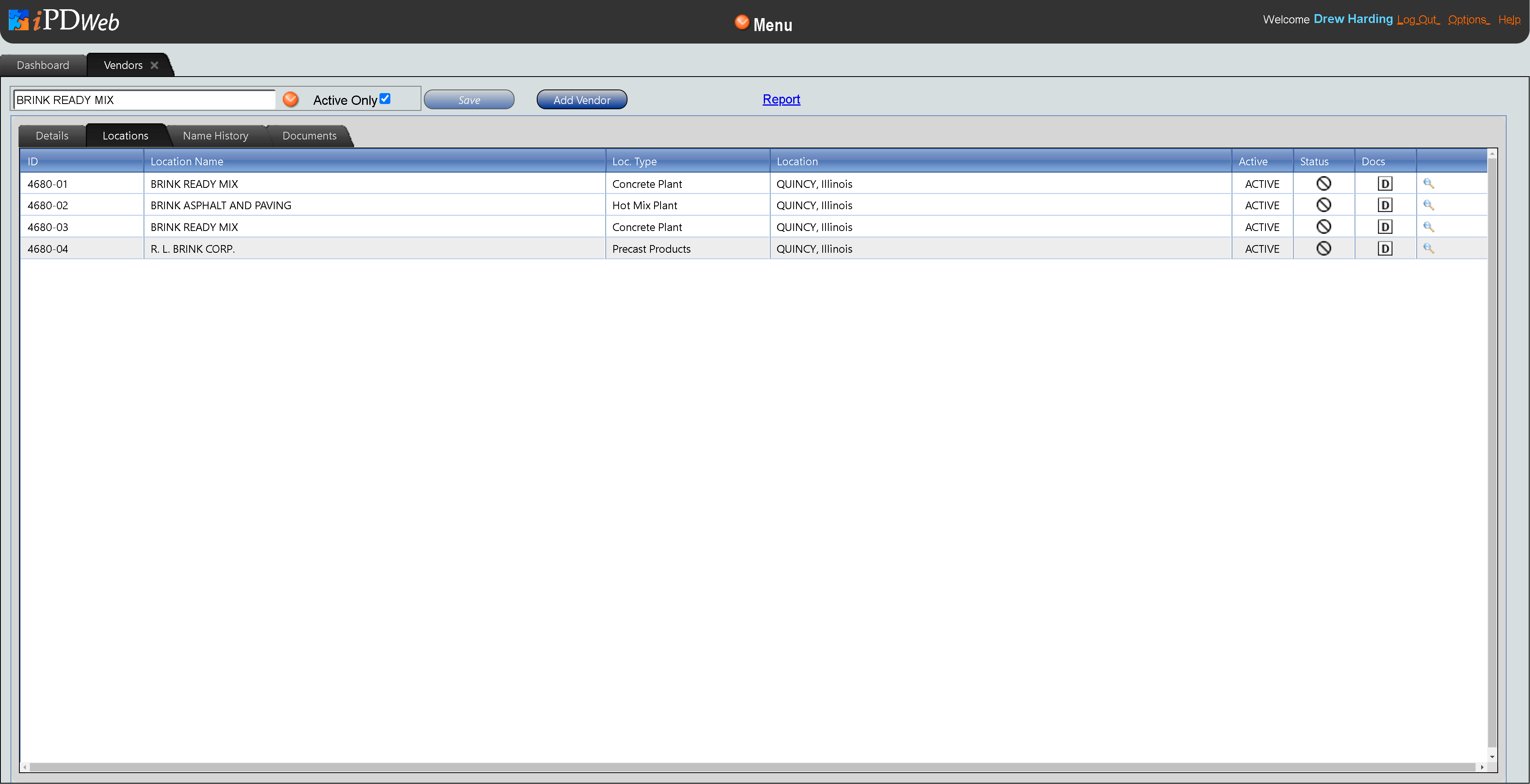 The Locations Tab is composed of a single table, which lists the different locations associated with a material vendor. From this tab, users can add locations and access windows to edit information about each location.