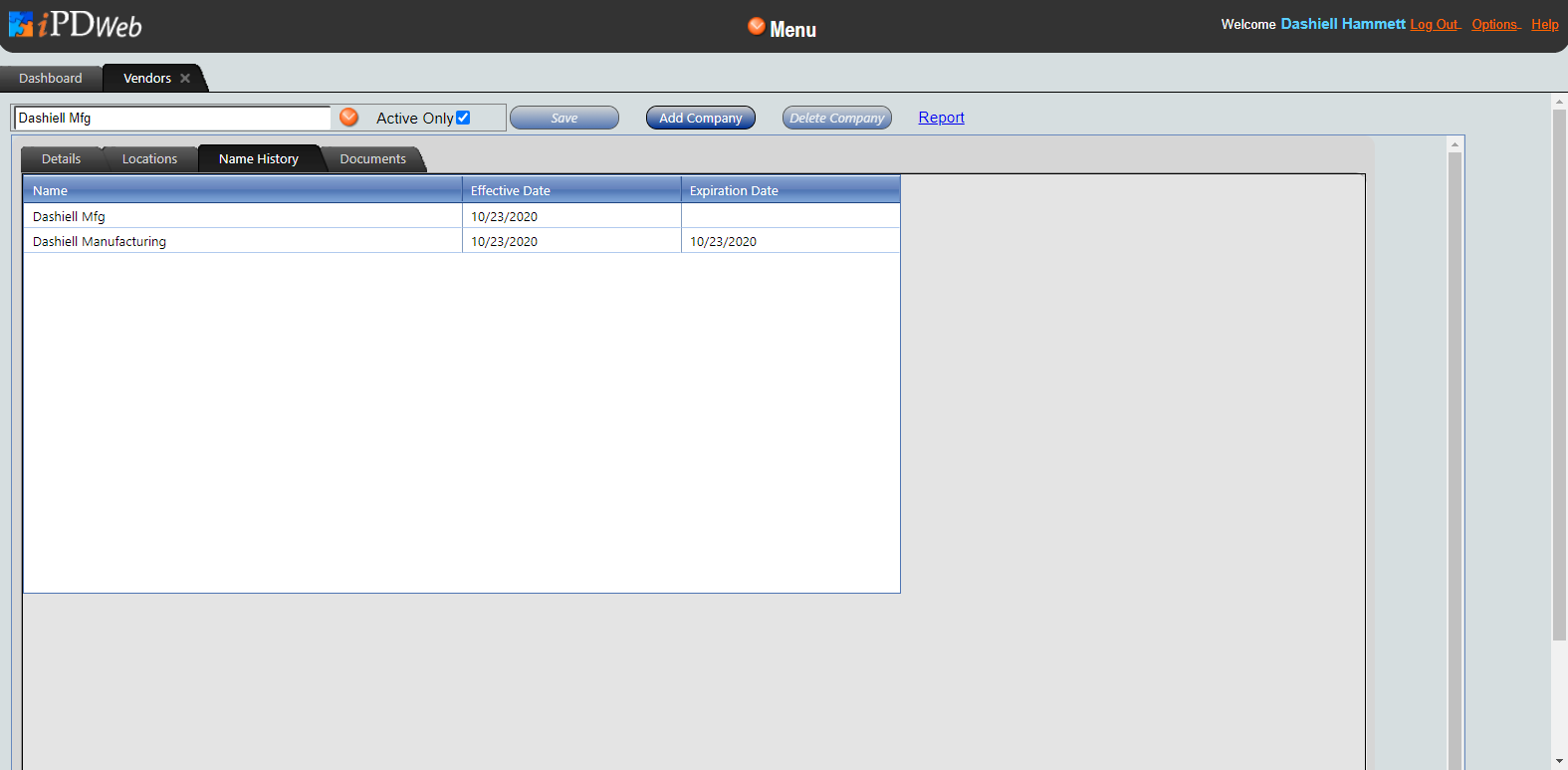 The Name History Tab is composed of a single read-only table, which displays the different names a company has used to refer to itself, as recorded through the Change Name function in the Vendors Window.