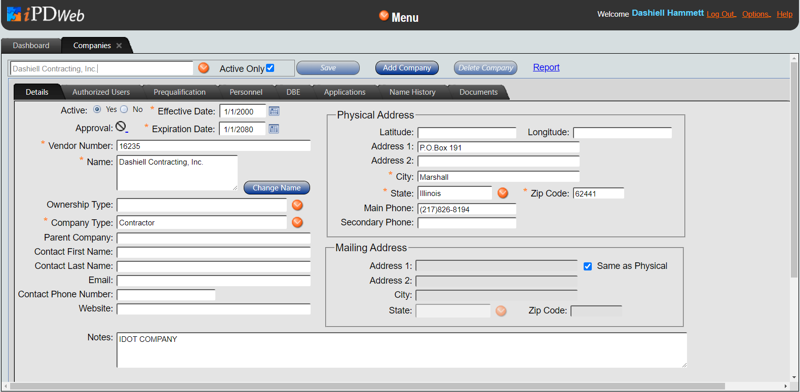 The Companies window is composed of eight tabs that manage the summary, authorized users, prequalification, personnel, DBE, Applications, Name History, and document information for a company. The basic function of each tab in the window is: