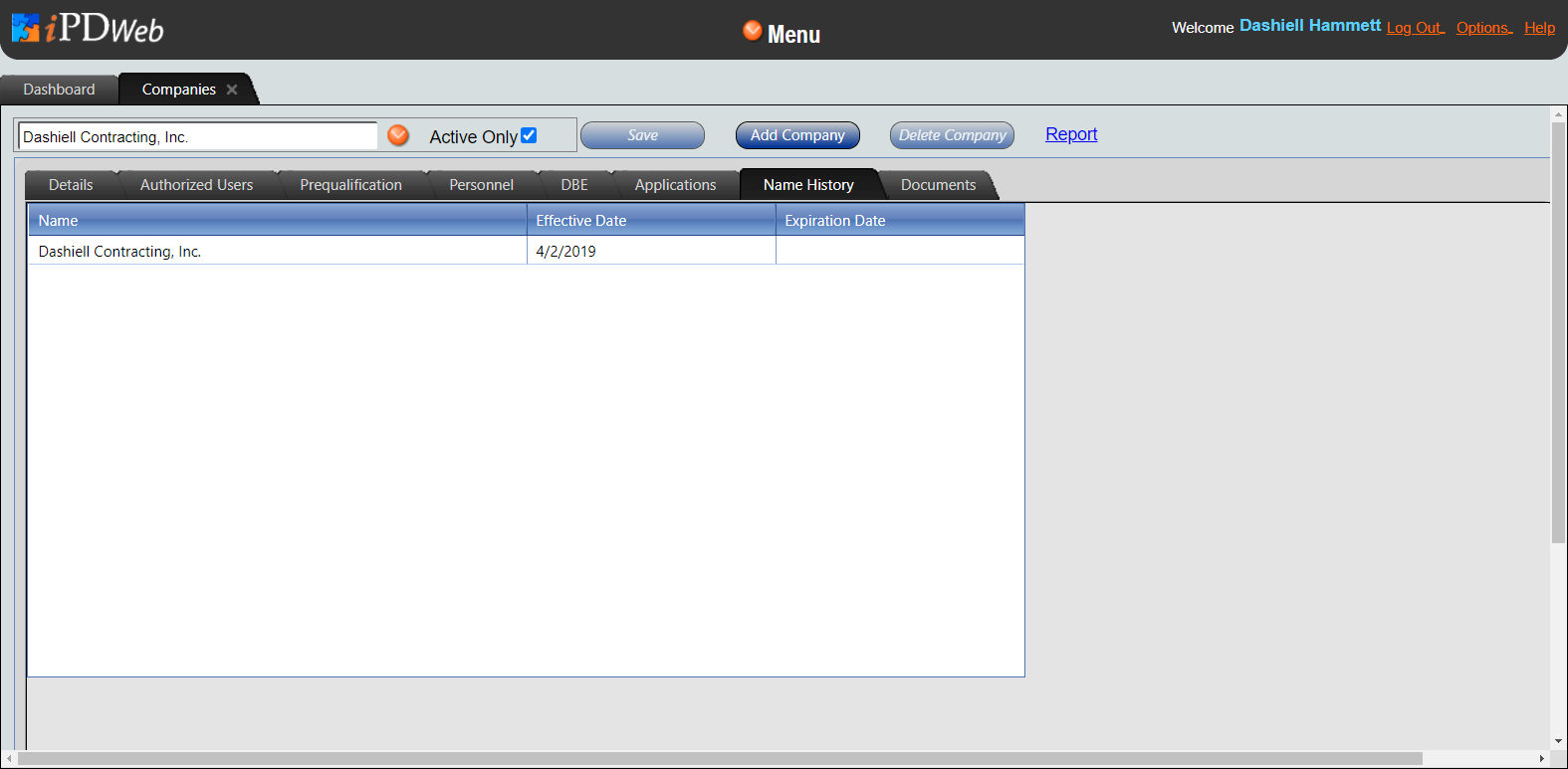 The Name History Tab in the Companies Window allows users to view the name history log for the company.