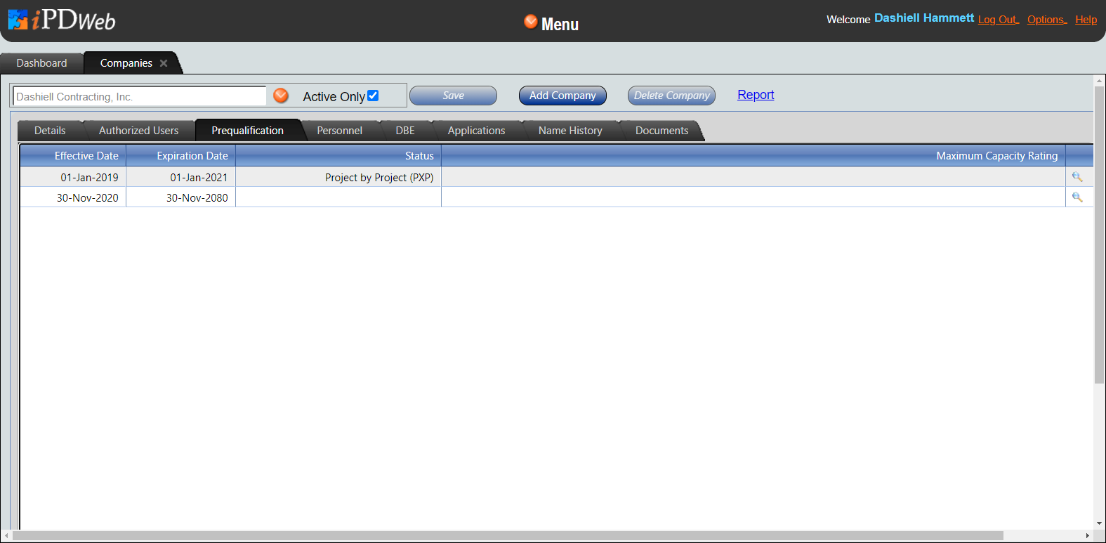 The Prequalification Tab in the Companies Window allows administrators to manage prequalification information for companies.