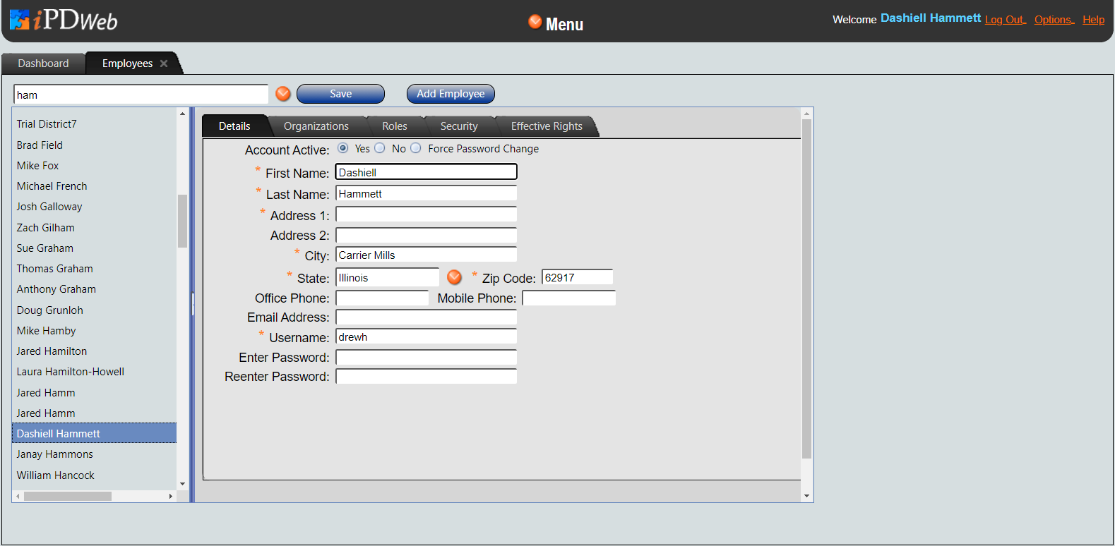 The Employees window allows a user to manage all the employee information needed in the iPDWeb application.