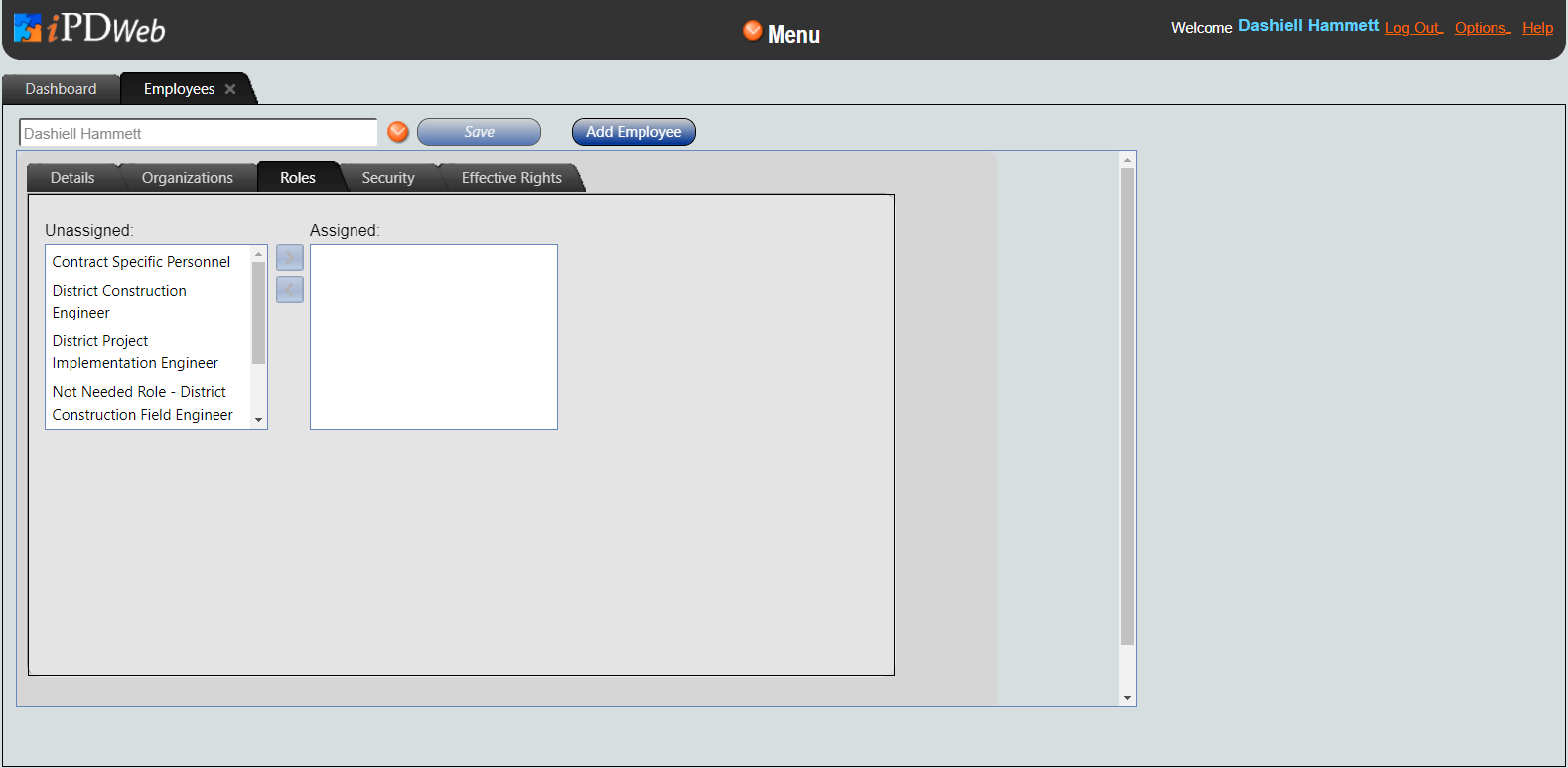 The Roles Tab in the Employees window allows administrators to describe the roles and responsibilities that employees have in relation to the iPDWeb application.