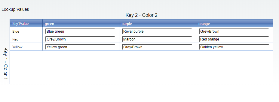 A lookup table is first configured with a grid of values. In the detail below, one axis (Key 1) is one color, and the other axis (Key 2) is a second color.