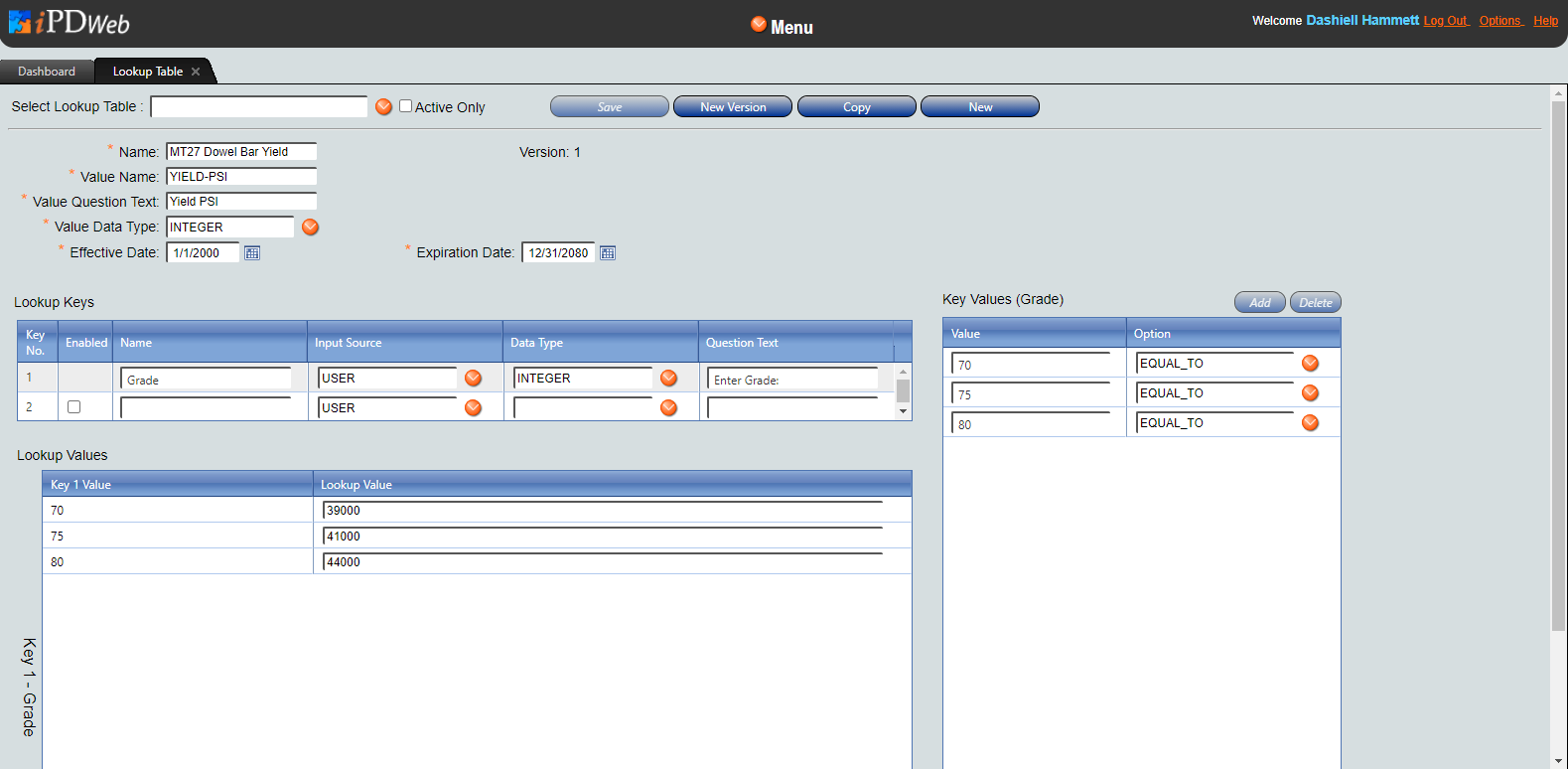 The Lookup Table Window is composed of editable header material and three editable tables, which contain Lookup Keys, Key Values, and Lookup Values. A user may add new or edit existing lookup tables from this window.