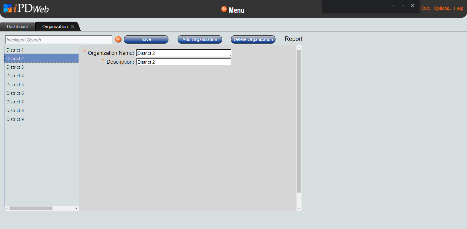The Organization window is composed of two fields, the organization name and organization description. Employees may be assigned to an organization in the Employees Window.