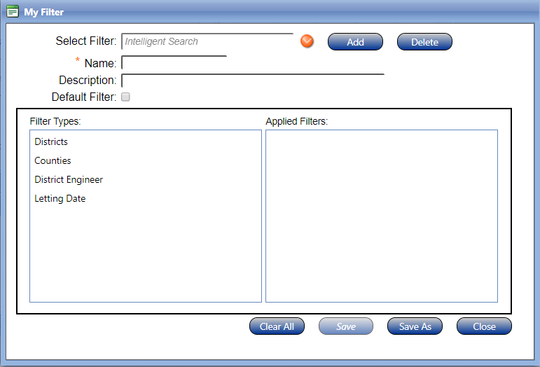 The My Filter window allows users to add, delete, and edit filters that can be applied to the My Contracts accordion in the Dashboard.